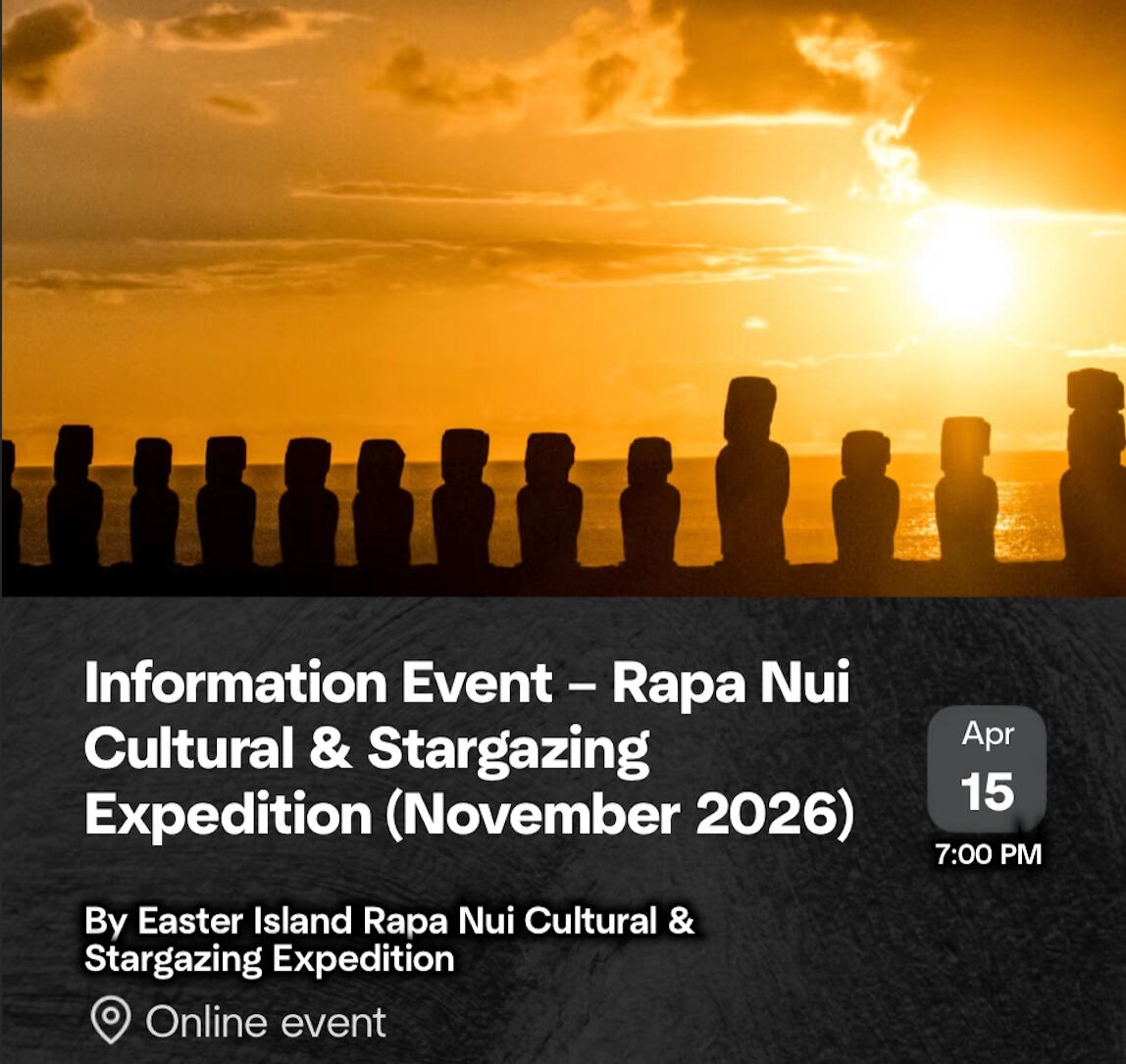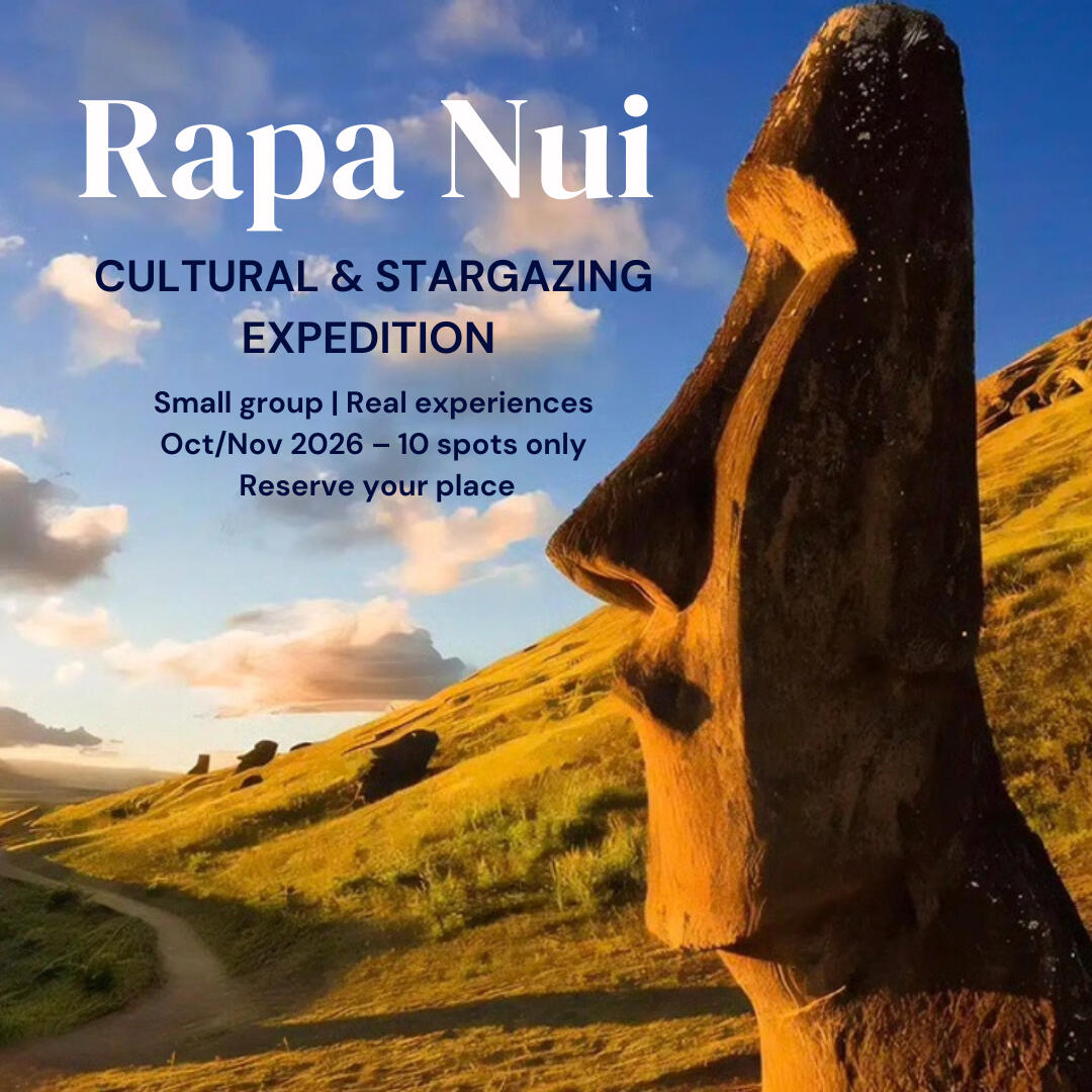 Have you ever wanted to stand among the mysterious Moai statues, hear Polynesian storytelling from the people who pass them down from generation to generation, and look up at one of the clearest night skies on Earth?This is an intimate, small-group expedition to Rapa Nui in October / November 2026, created for travellers seeking something deeper than a typical trip.Your experience includes: